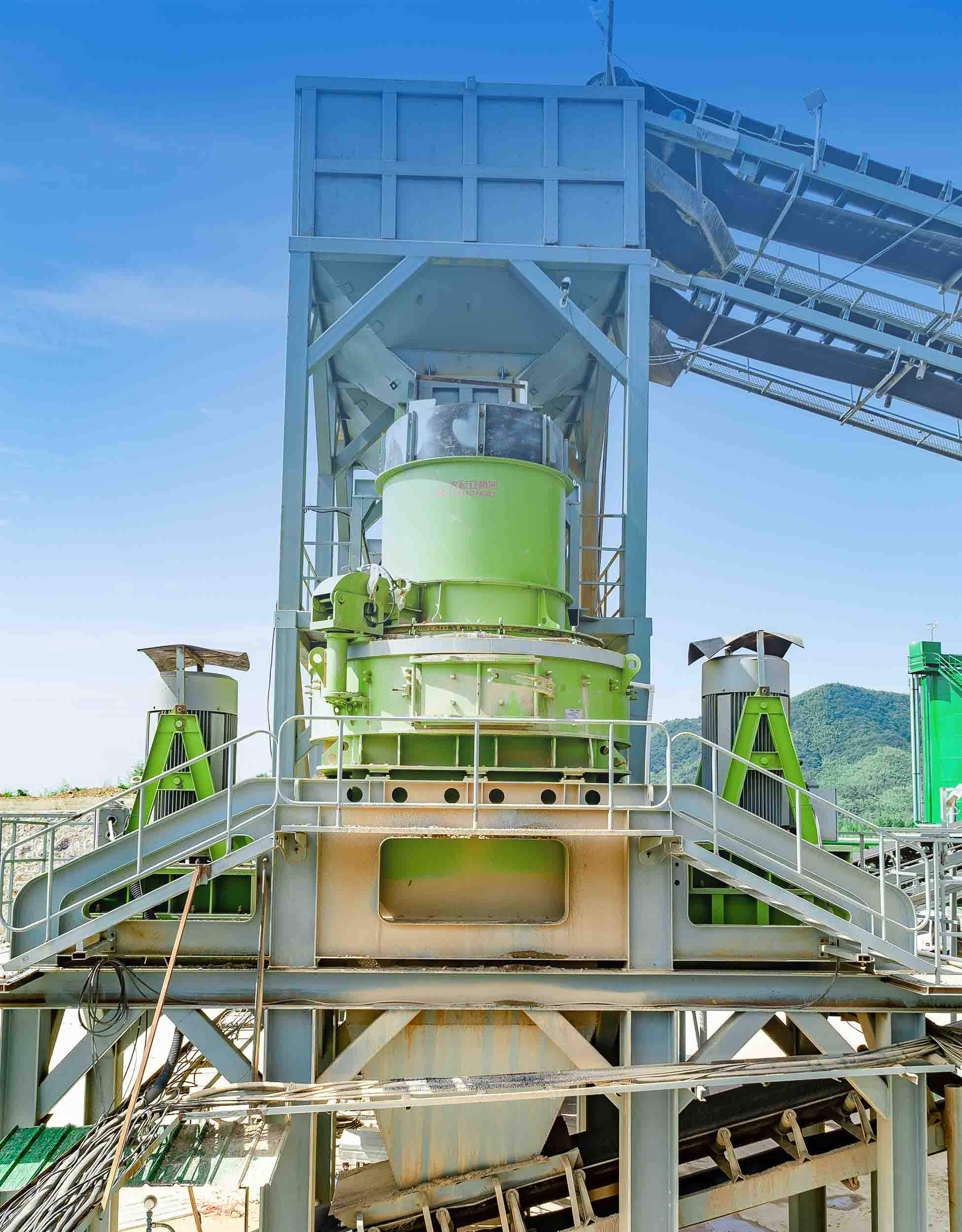此條生產線以大鄂破機、單缸液壓圓錐破碎機、沖擊破制砂機、對輥機(高壓輥磨機)等主機為核心,采用全自動中央控制系統(tǒng),動態(tài)調整成品砂石比例,甚至可實現(xiàn)全制砂生產